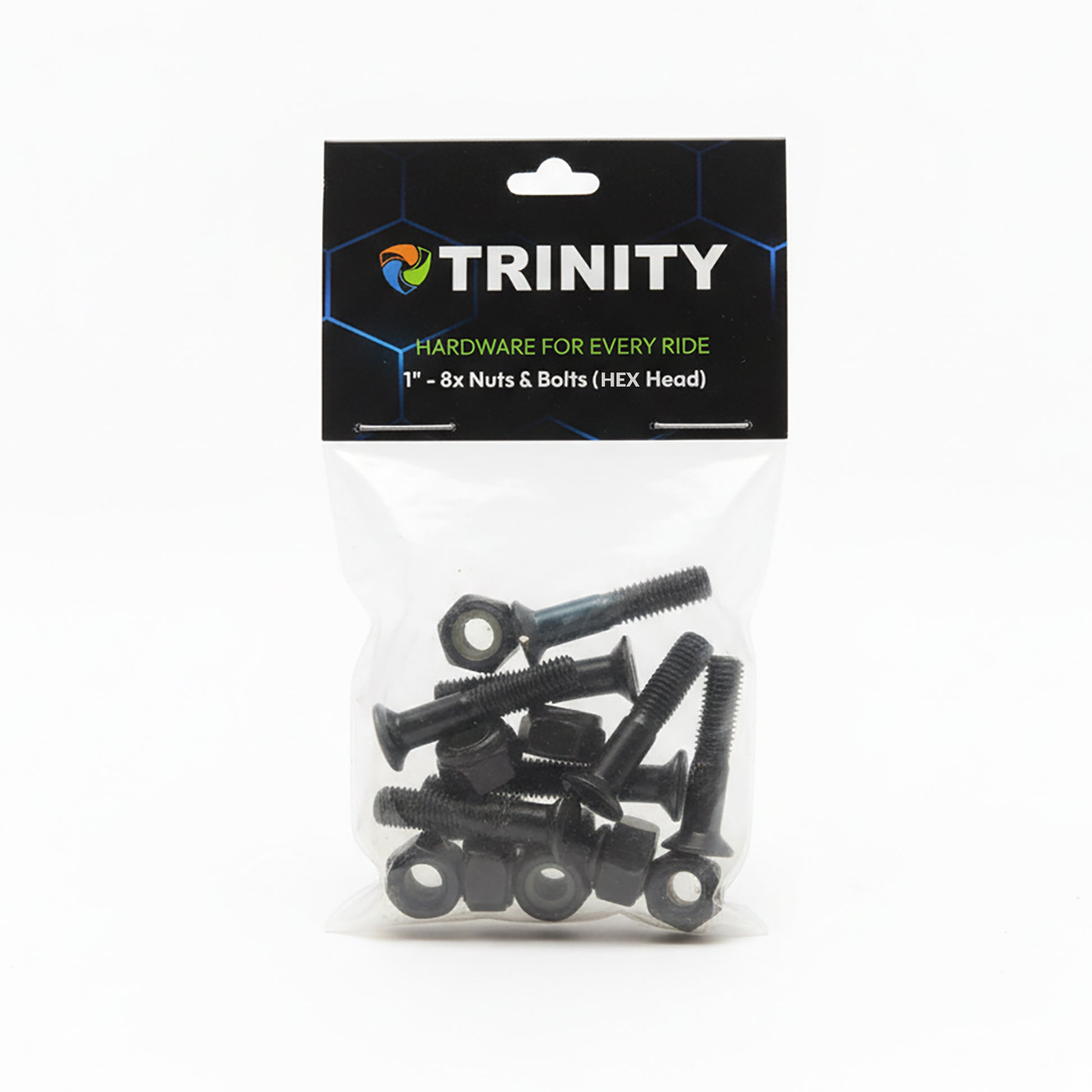 De TRINITY hardware set van 8 bouten en moeren in 1 1/4" lengte biedt een betrouwbare en trillingsvrije bevestiging voor diverse skateboard setups. Dankzij de zelfborgende moeren en compatibiliteit met risers is deze hardware ideaal voor skaters die op zoek zijn naar extra clearance en een nette afwerking.